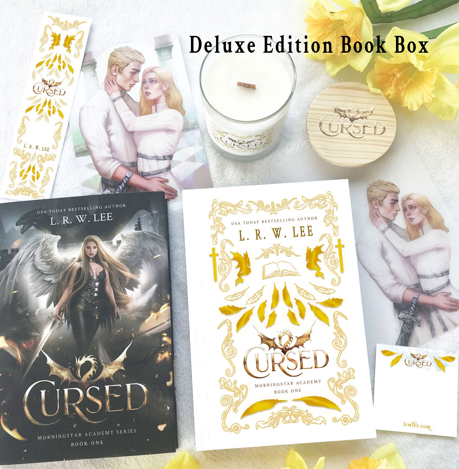 Deluxe edition book box: (1) signed deluxe edition hardback, (1) signed book mark, (1) gorgeous illustrated art print, (1) amazing page overlay, (1) heavenly scented wood wick candle, (1) Cursed post-it notes